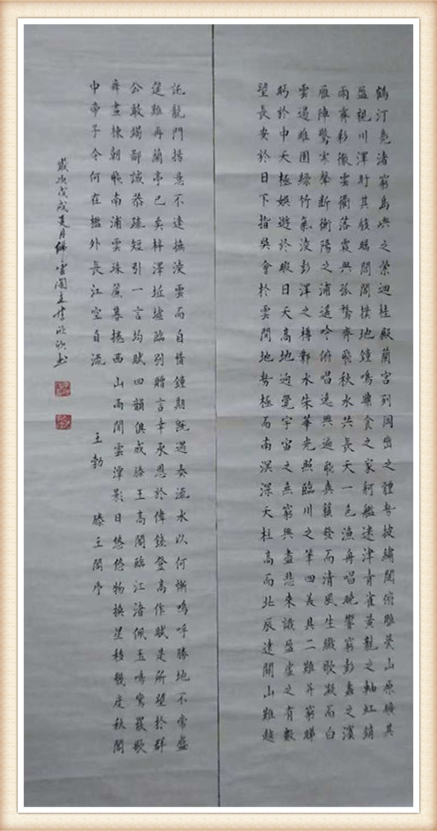 在其父长期的熏陶和传授下,书艺的成就突飞猛进,几十年的勤耕不辍,近期又受到上海书法名家王宜明先生的知道,对工草隶篆行的书体有了更深的体会,在此基础上,将其父九怪书法的完善和发扬走上了新的高度,把父传授的古文百字图(百龟、百龙、百寿、百福、百羊、百马、百猴、百蛇、百鸡、百禄等)传承和创新,使百字图更加字字呈祥,妙合自然,意幻无穷,使九怪书法和百字图得到了更好发展,收到了更多爱好者的喜爱和收藏,其书抑扬顿挫,布局错落有致,其势散而不乱,整体行云流水,使古朴的文字散发出新时代的韵味。