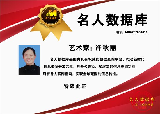 创作的网络作品很多,她的作品曾获得省级一等奖、二等奖、市级特等奖等。擅长国画,花鸟作品,拜著名国画大师刘石平的弟子知名画家李喜连为师,是中国著名画家傅抱石第四代弟子,拜知名书画家闵贵森为师,并向书画家吕新田老师不断的学习和研究绘画技法和艺术美,她擅长画梅兰竹菊,荷花,她不断的临摹和研究王成喜的梅花,郑板桥的竹子、兰花,齐白石的桃子,吴昌硕的菊花,石涛的山水、王雪涛的牡丹、李喜连的梅兰竹菊、闵贵森的山水等,从中汲取精华,融古通今,形成了自己独有的的书风、画法作品,作品深受大家喜爱,并被许多收藏家们珍藏....很多画家称她具有超高的绘画天赋,是一位德艺双馨的艺术家,难得的全能型艺术家。被人赞到:全能艺术许秋丽,道中才女有豪气。巧书善画露英姿,音画诗作超精艺。百样图谱胸中装,诗情画意笔下现。兴来挑灯画竹菊,更有神笔写梅兰。临摹大家荷桃竹,游刃有余现风采。舞出人生乐华年,音画诗把正能传。