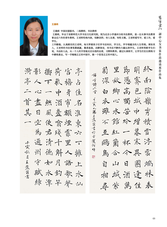 为迎接中国共产党第二十次全国代表大会的召开和庆祝中华人民共和国成立七十三周年,由北京市通州区文化馆主办的《蕙质兰心•副中心女书家作品邀请展》与大家见面了。由于场地限制,这次仅邀请了部分女书家参展,她们分别来自通州区各行各业,有的忙碌于副中心建设,有的在家相夫教子,有的尚在校就读。但她们有一个共同特点就是有着对书法艺术的挚爱,有着在书法研习道路上的辛勤耕耘,且分别在各级展览中取得过不俗的成就,充分展示了副中心女性书法家蕙质兰心的魅力。无论是作品的外在形式,还是书写内容的选择,或是作品的质量,均让人耳目一新。此次展览是一次展示,也是一次交流,更是一次鞭策,期望她们继续认真学习和落实习近平总书记关于文化建设的重要指示,推出更多更好的书法作品,为繁荣副中心的文艺事业做出新的贡献。