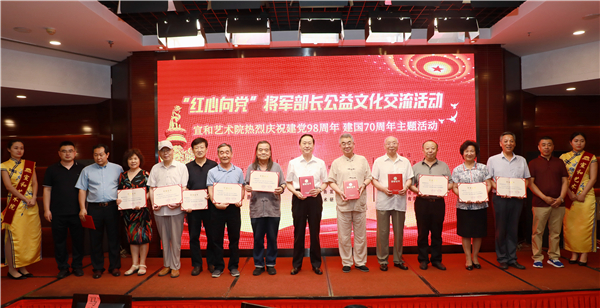 宣和网讯(记者 冯永军 杨坤明 摄影 武锐利 刘世超)在中国共产党建党98周年之际,为了庆祝党的生日,迎接建国70年来所取得的伟大成就,讴歌伟大、光荣、正确的中国共产党。6月28日下午,由北京宣和书画艺术研究院、中国将星墨韵书画院主办;公益在线、中国周易新闻网、师说文化传媒有限公司、北京公益服务发展促进会,北京师白艺术研究会协办;飞驰环球文化传播集团有限公司承办的宣和艺术院“红心向党”将军部长、名人名家公益文化交流活动,同时宣和书画艺术研究院分院授牌仪式在北京紫玉饭店隆重举行。
